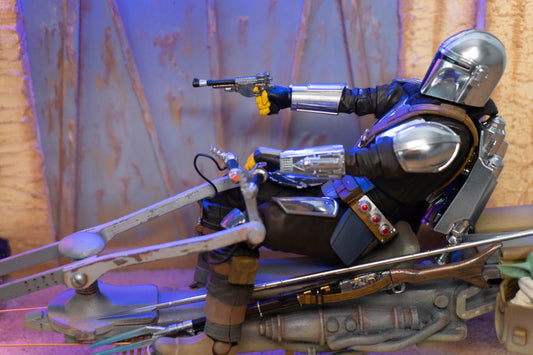 The Mandalorian Diorama on Speeder bike with Goru diorama with Display case